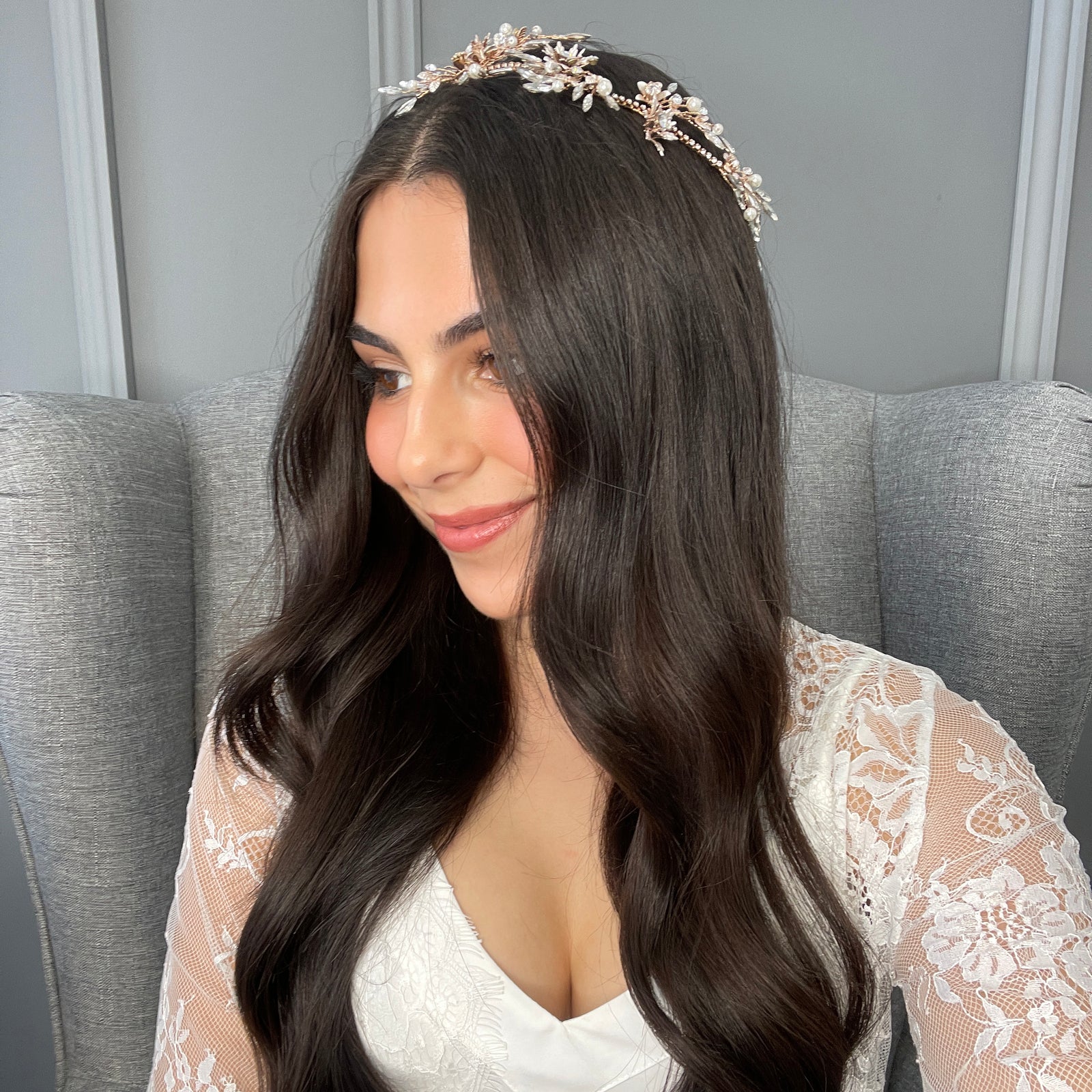 Eloa is a stunning floral vine, made with porcelain flowers, brushed metal leaves, and sprigs of crystals and pearls. She has a hint of gold showing through.